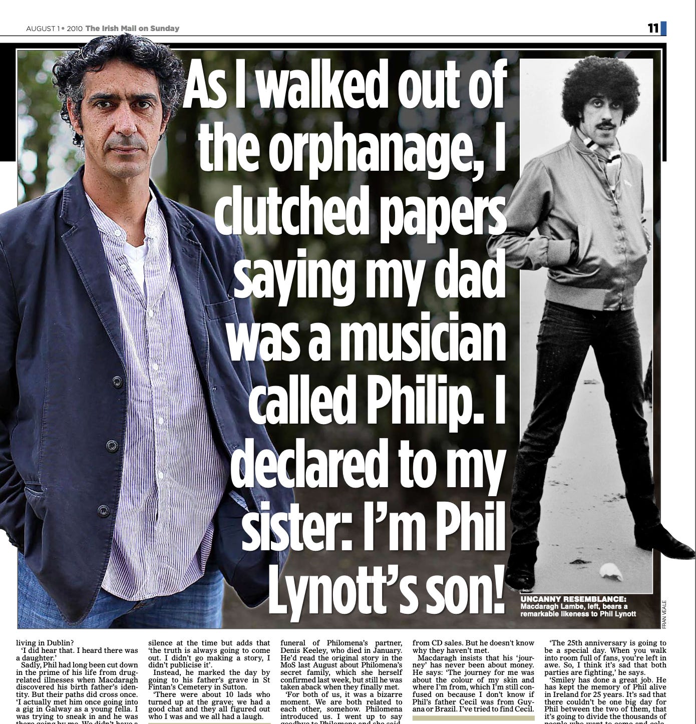 But any lingering doubts vanished forever when Phil’s mother, Philomena Lynott broke her silence on Macdaragh and finally acknowledged him in an extraordinary 11-page interview with me in the Irish Mail on Sunday and Irish Daily Mail, which ran over three days in 2010. In it, Philomena also revealed she had given two of her other children secretly up for adoption. Macdaragh was ‘without a doubt’, she told me, her grandson.
